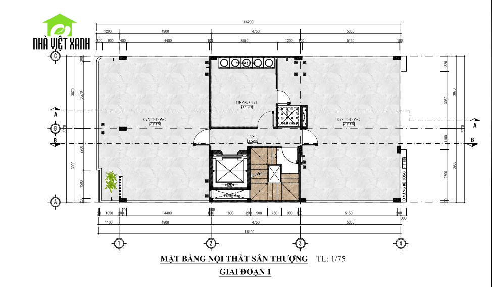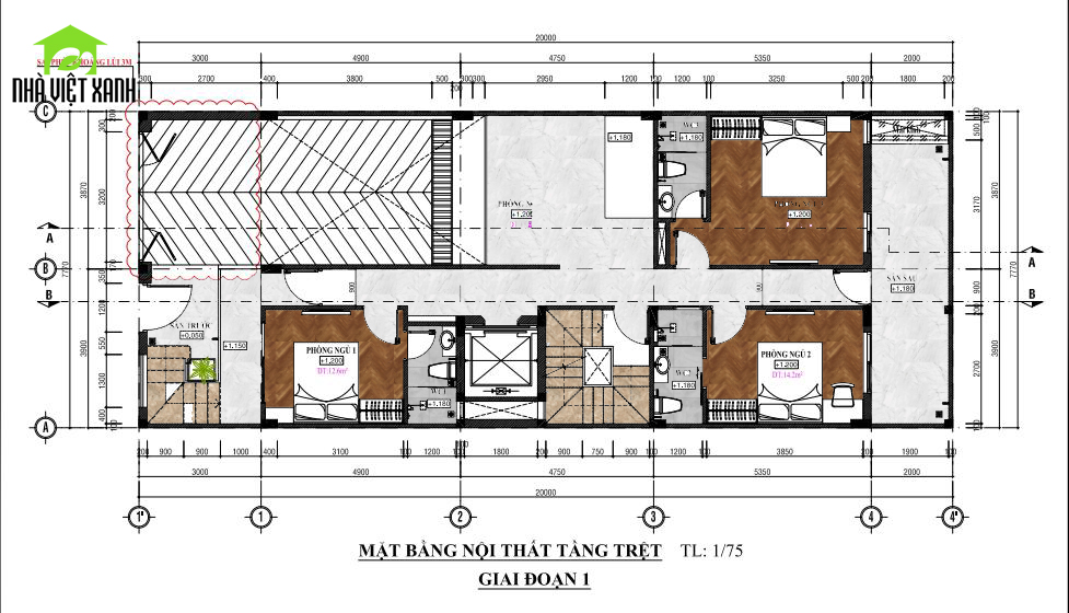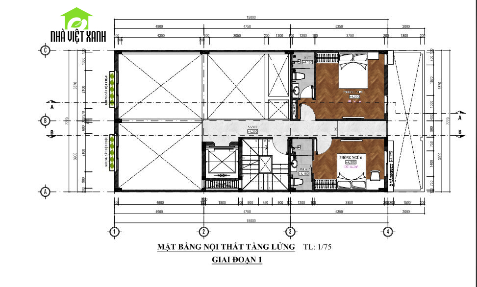 Tầng lửng: 2 phòng ngủ (phòng ngủ 4, 5) có vệ sinh riêng, hành lang kết nối