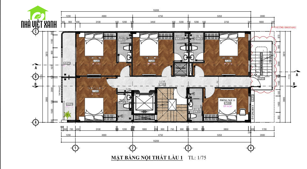 Lầu 1: 4 phòng ngủ (phòng ngủ 6, 7, 8, 9), mỗi phòng đều có WC riêng, hành lang trung tâm