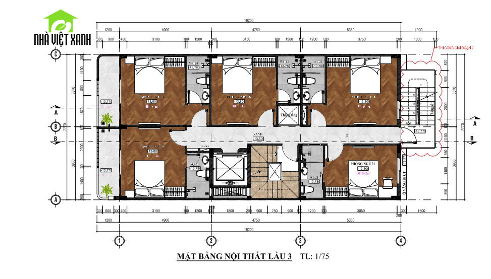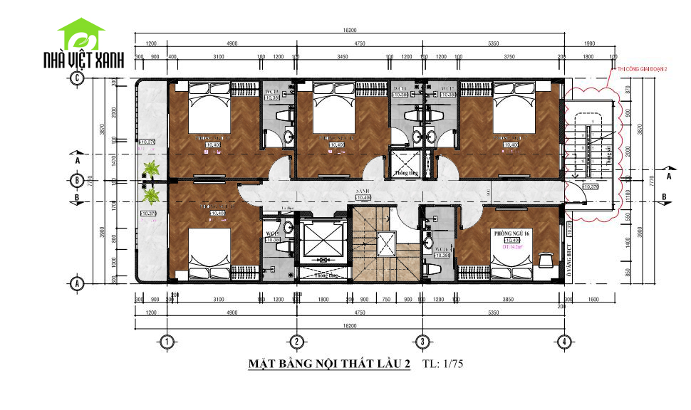 Lầu 2: 4 phòng ngủ (phòng ngủ 10, 11, 12, 13), tương tự công năng lầu 1