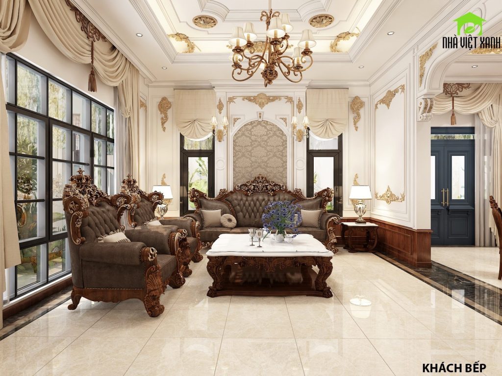 Phòng khách sử dụng sofa bọc nệm thủ công, chạm khắc tinh xảo