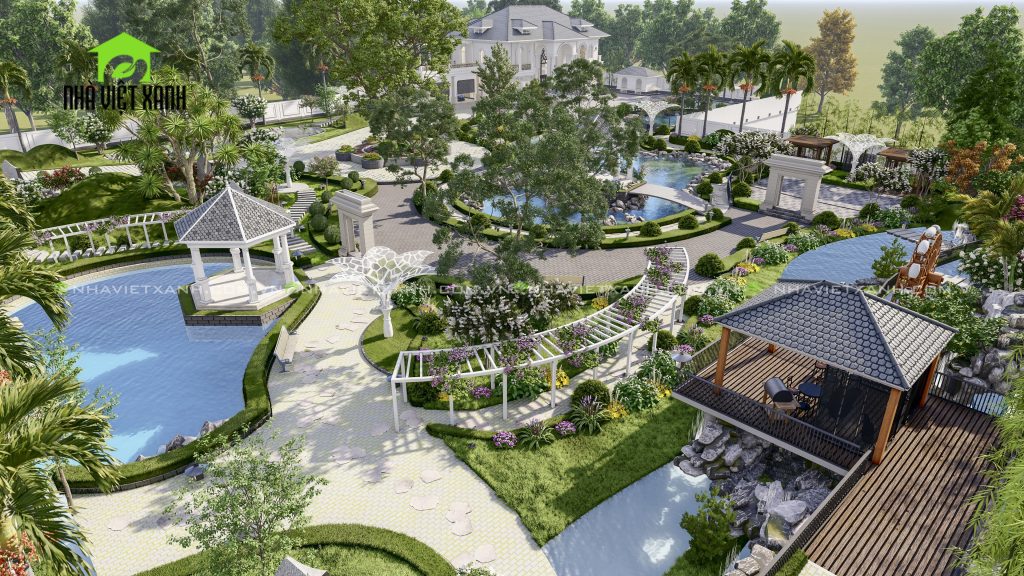 • Hệ thống lối đi lát đá, vườn hoa tỉa gọn và thảm cỏ mượt mà thể hiện sự đầu tư chỉnh chu trong từng chi tiết