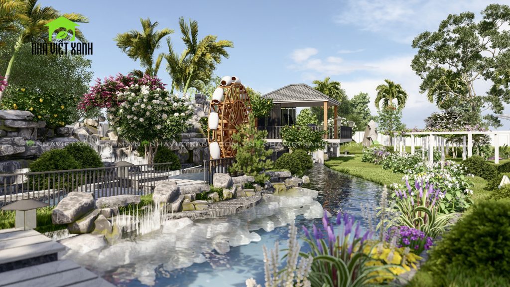 • Hồ cá koi, suối nhân tạo và tiểu cảnh cây xanh được bố trí mềm mại, mang đến không khí trong lành và phong thủy hanh thông