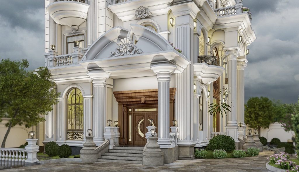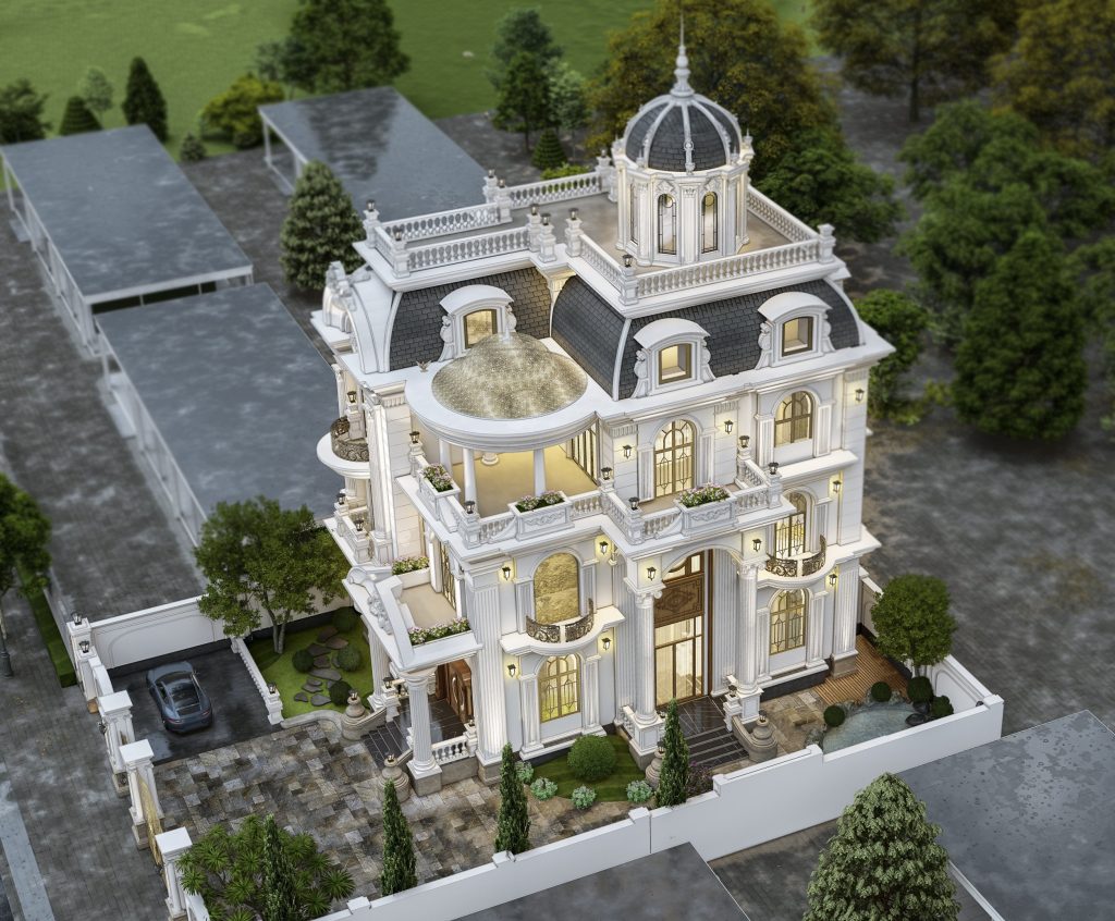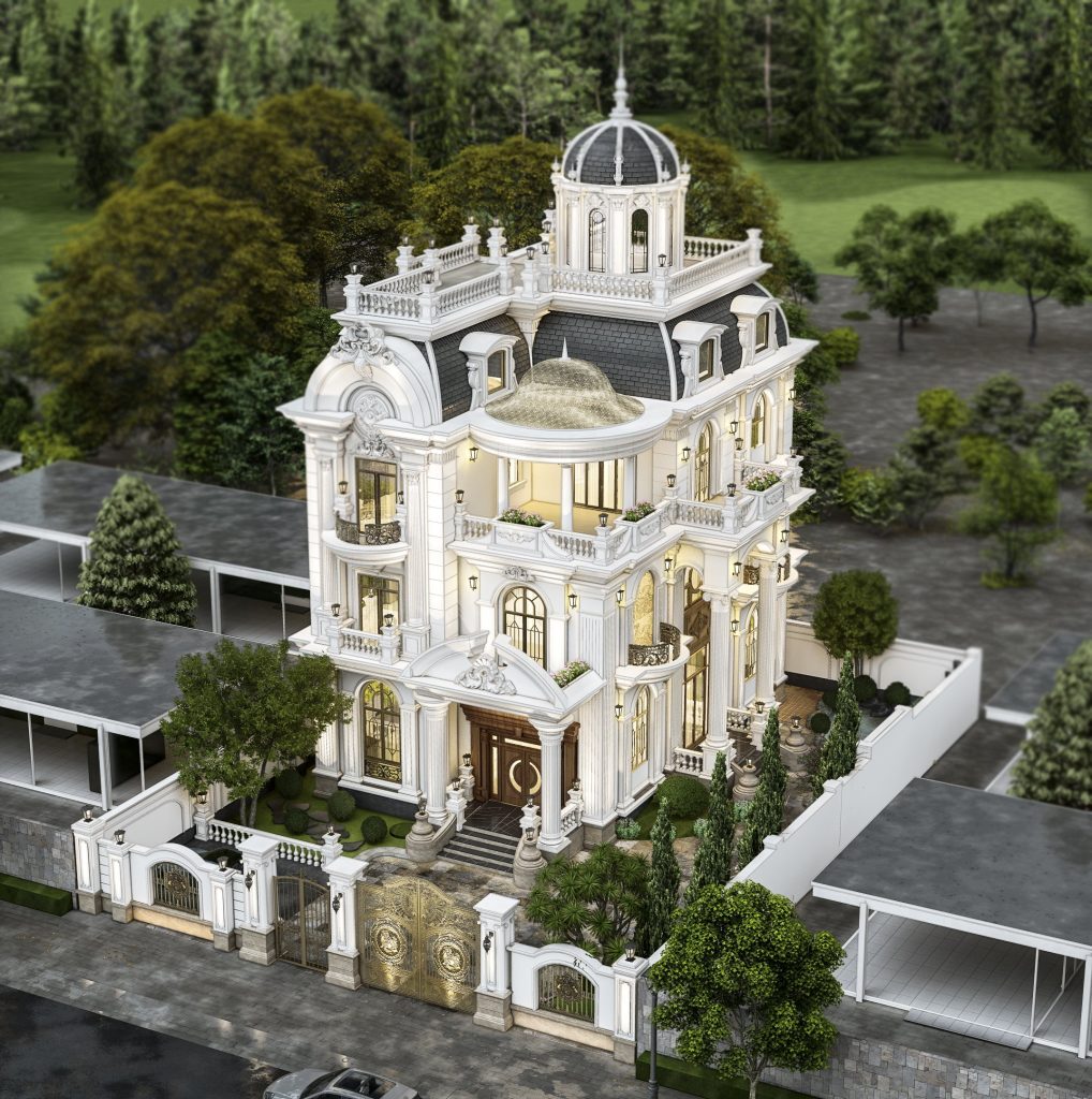 Từ ngoài nhìn vào, biệt thự nổi bật với hệ cột trụ đối xứng, mái vòm lớn trung tâm, các chi tiết phào chỉ đắp nổi công phu, lan can sắt uốn hoa văn cổ điển, kết hợp màu sơn trắng kem – tất cả toát lên vẻ quý phái, hoàng gia.
