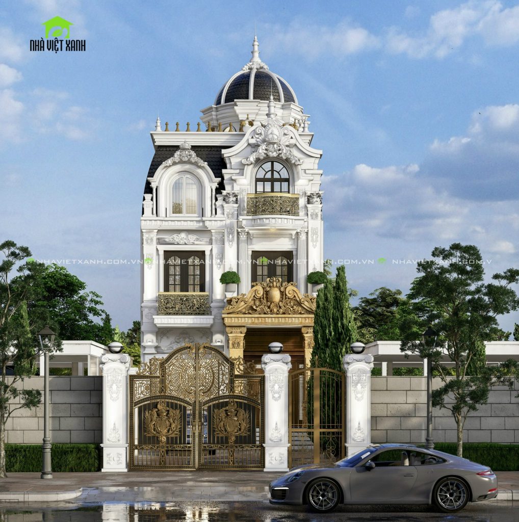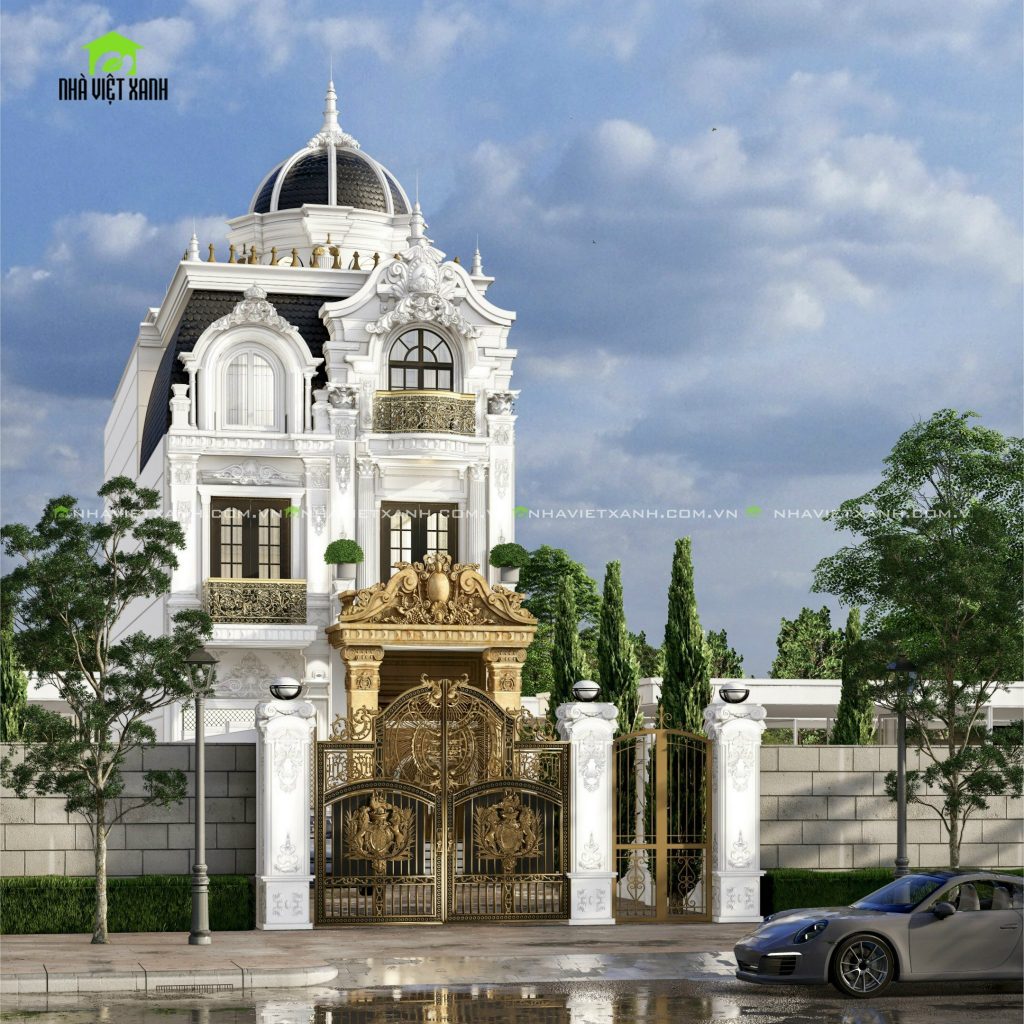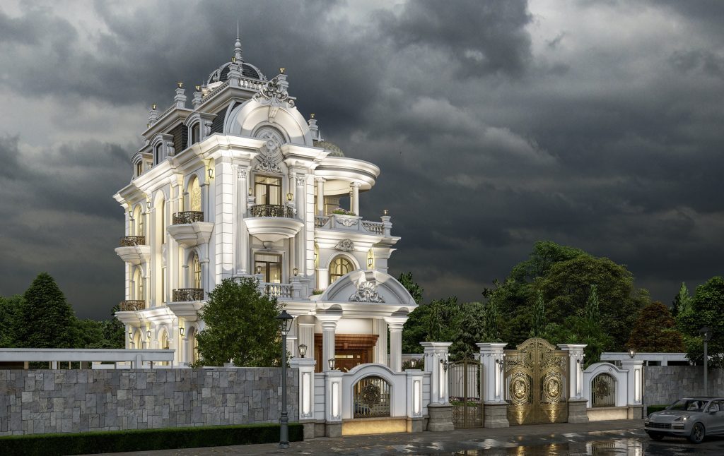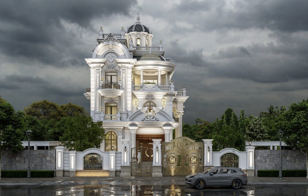 - Tầng trệt: Tiền phòng, phòng khách, phòng ngủ, phòng thay đồ, khu vực bếp – bàn ăn, gara ô tô