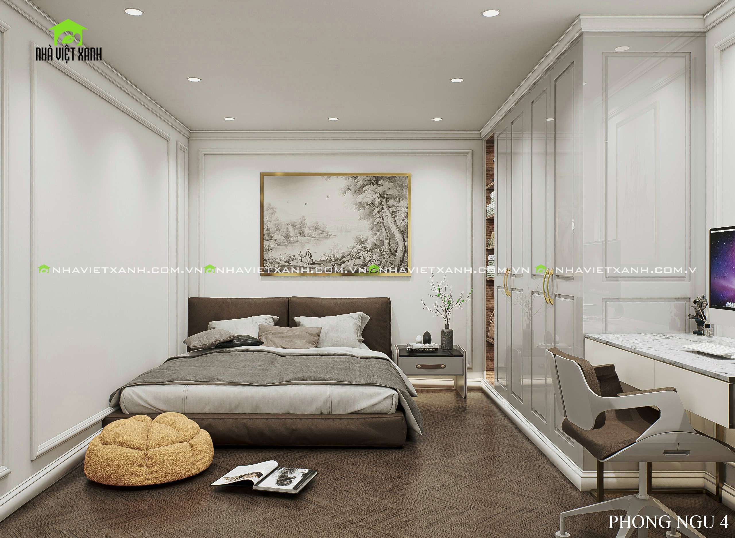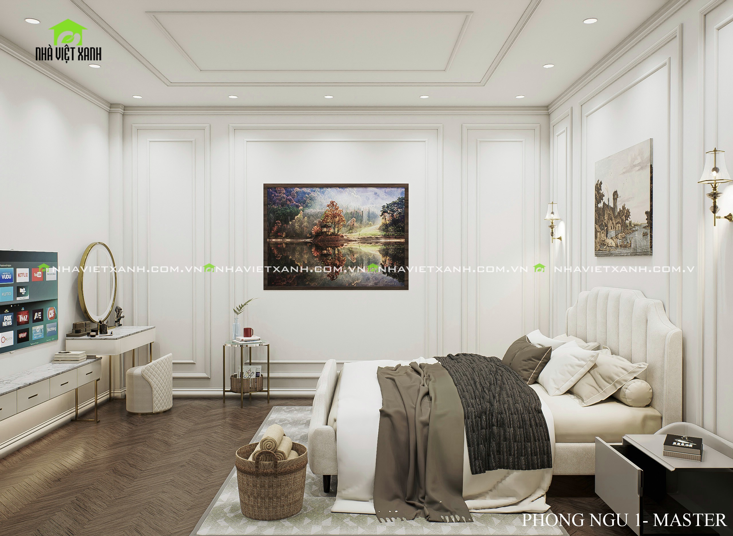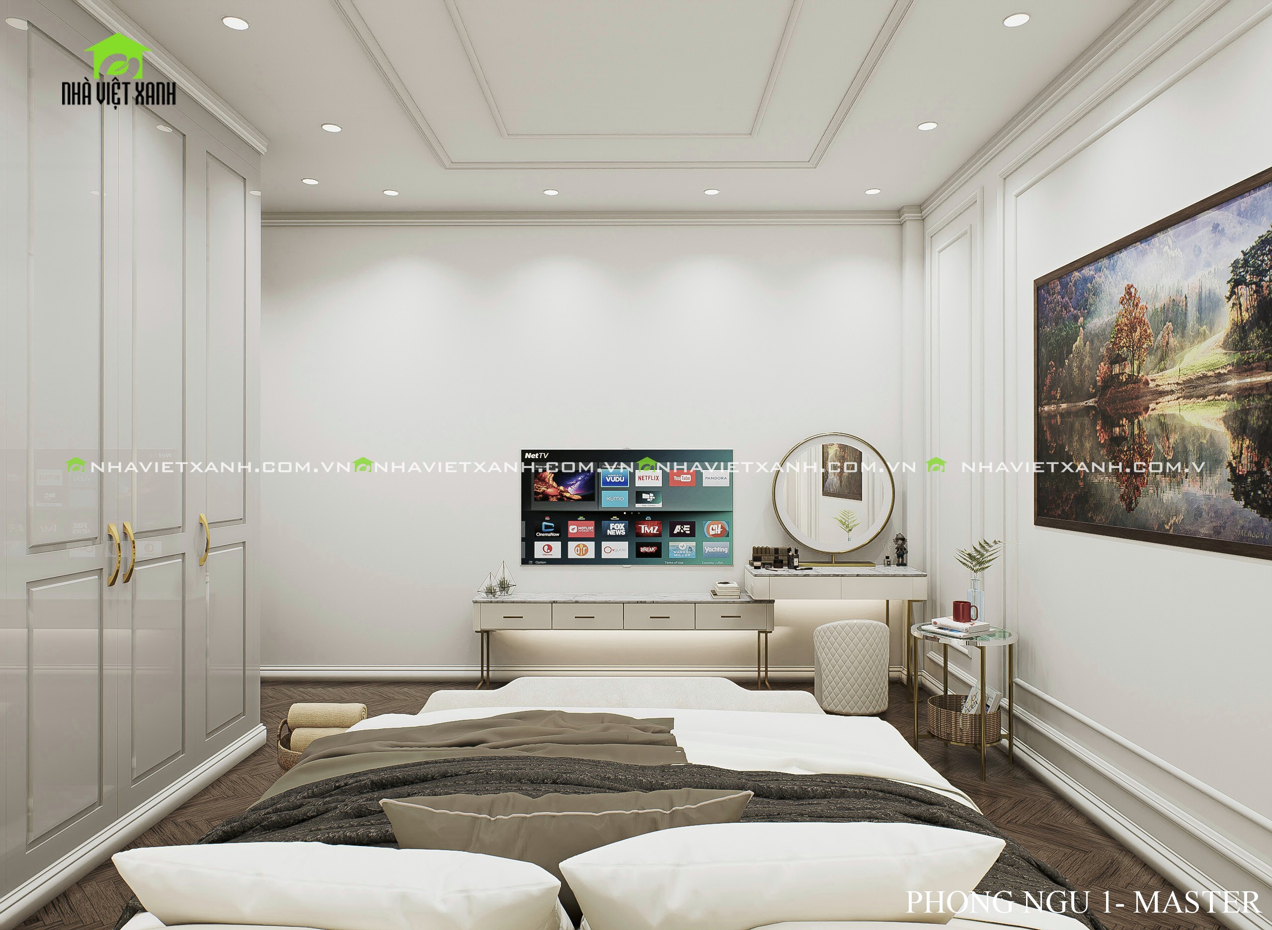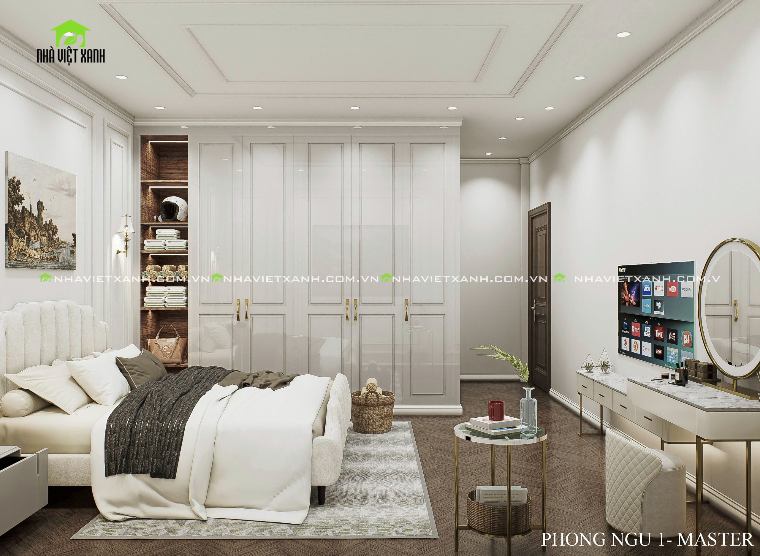 • Phòng ngủ master: Rộng rãi, tích hợp bàn trang điểm, kệ tivi và không gian đọc sách riêng tư.