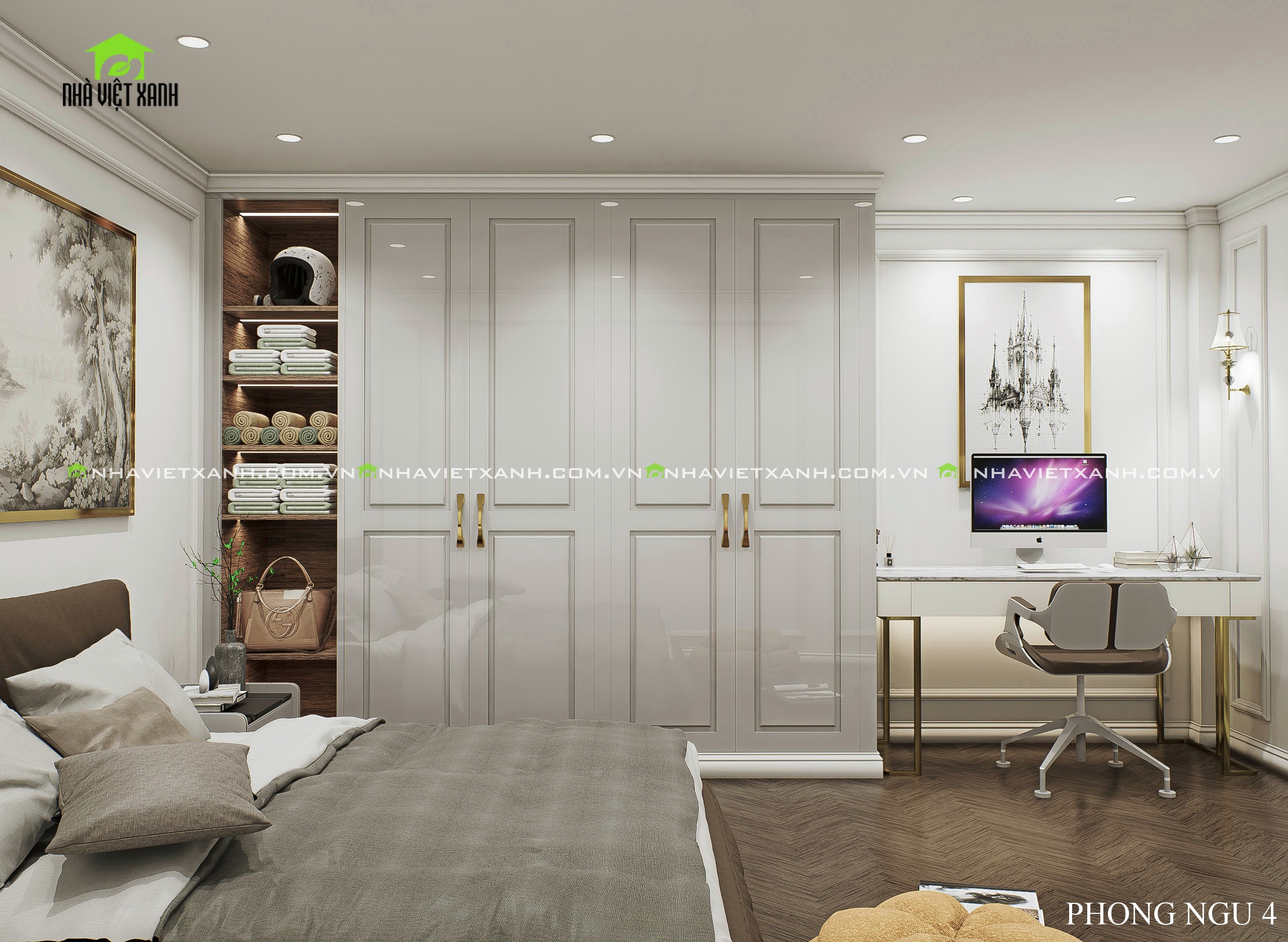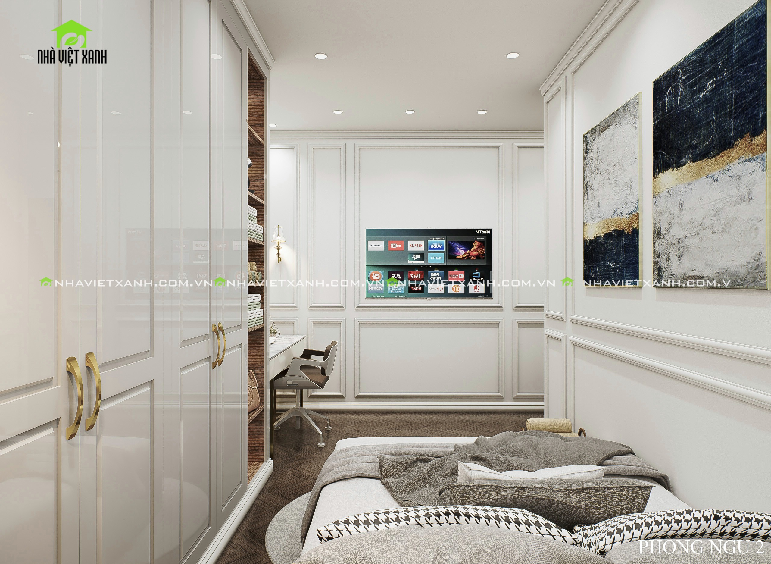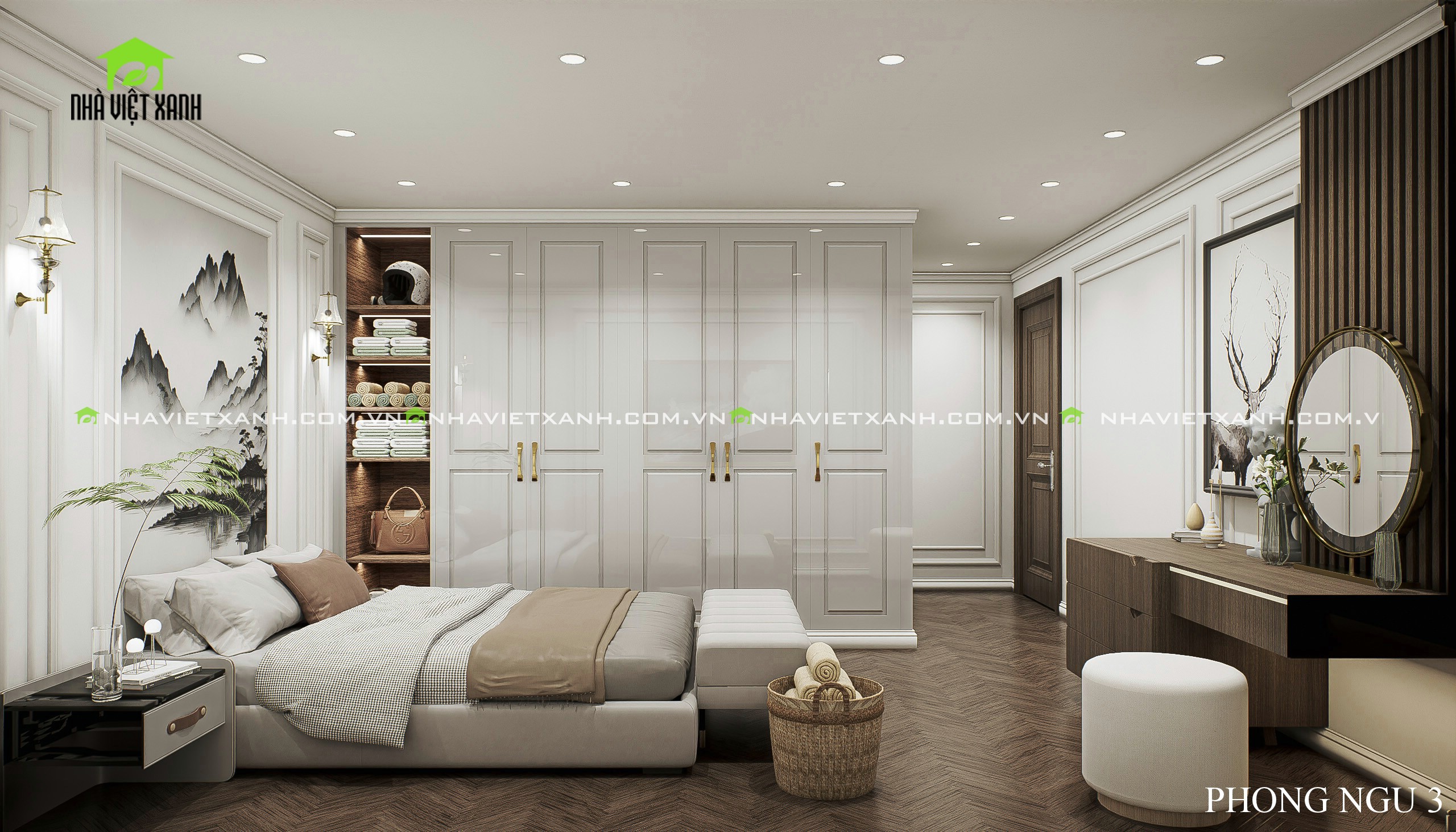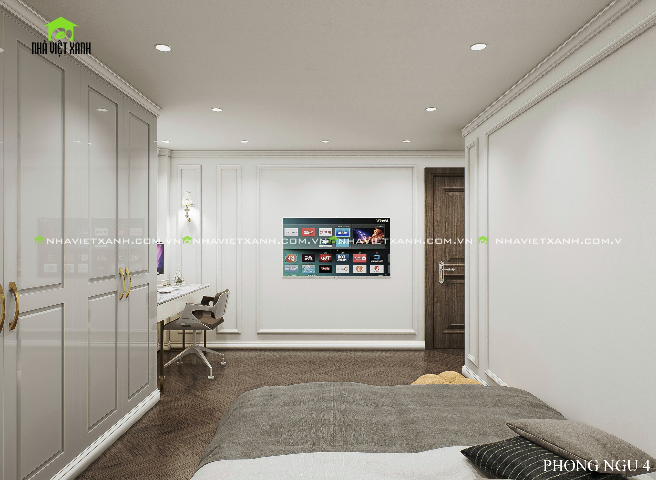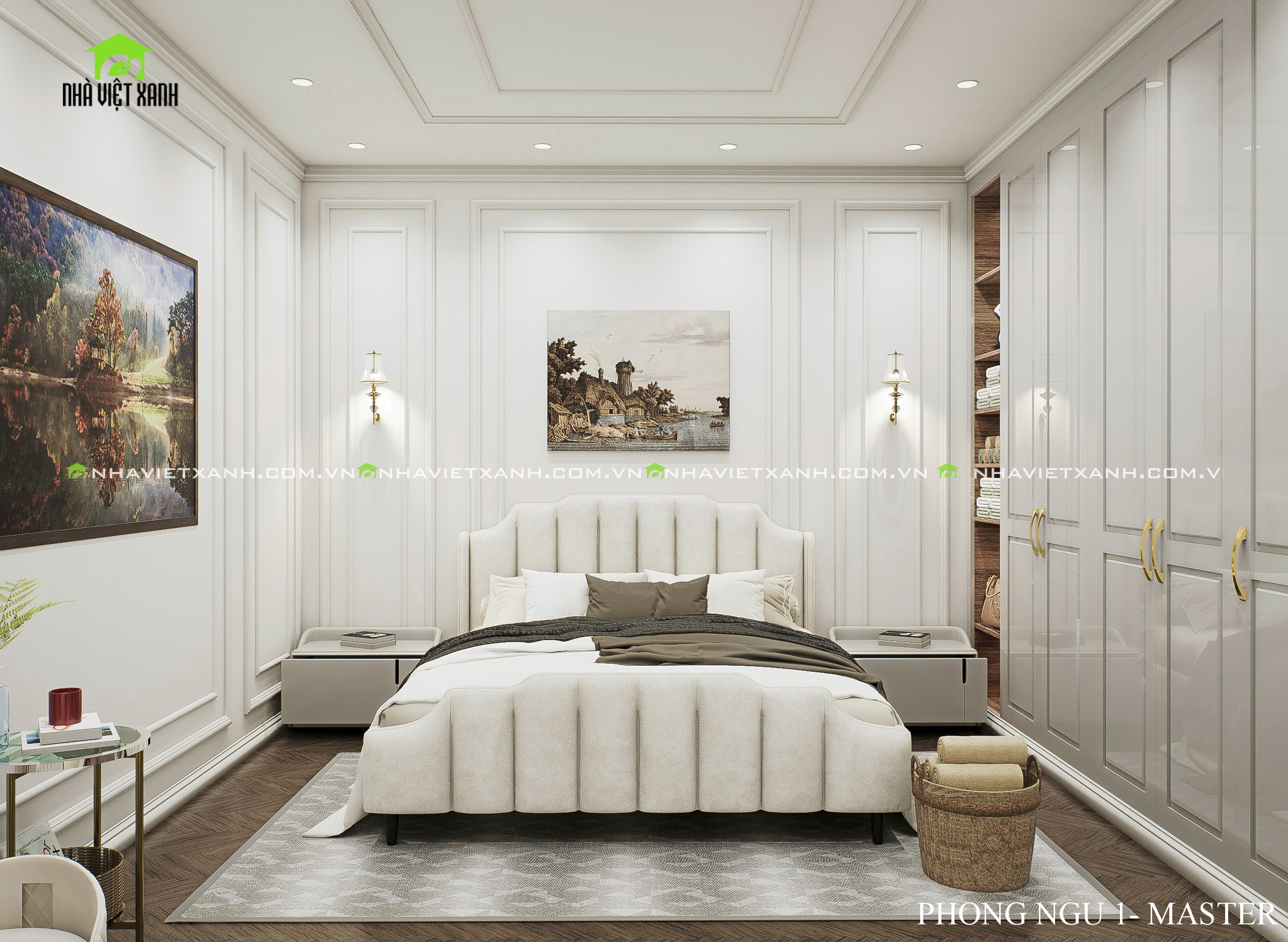 • Phòng ngủ master: Rộng rãi, tích hợp bàn trang điểm, kệ tivi và không gian đọc sách riêng tư.