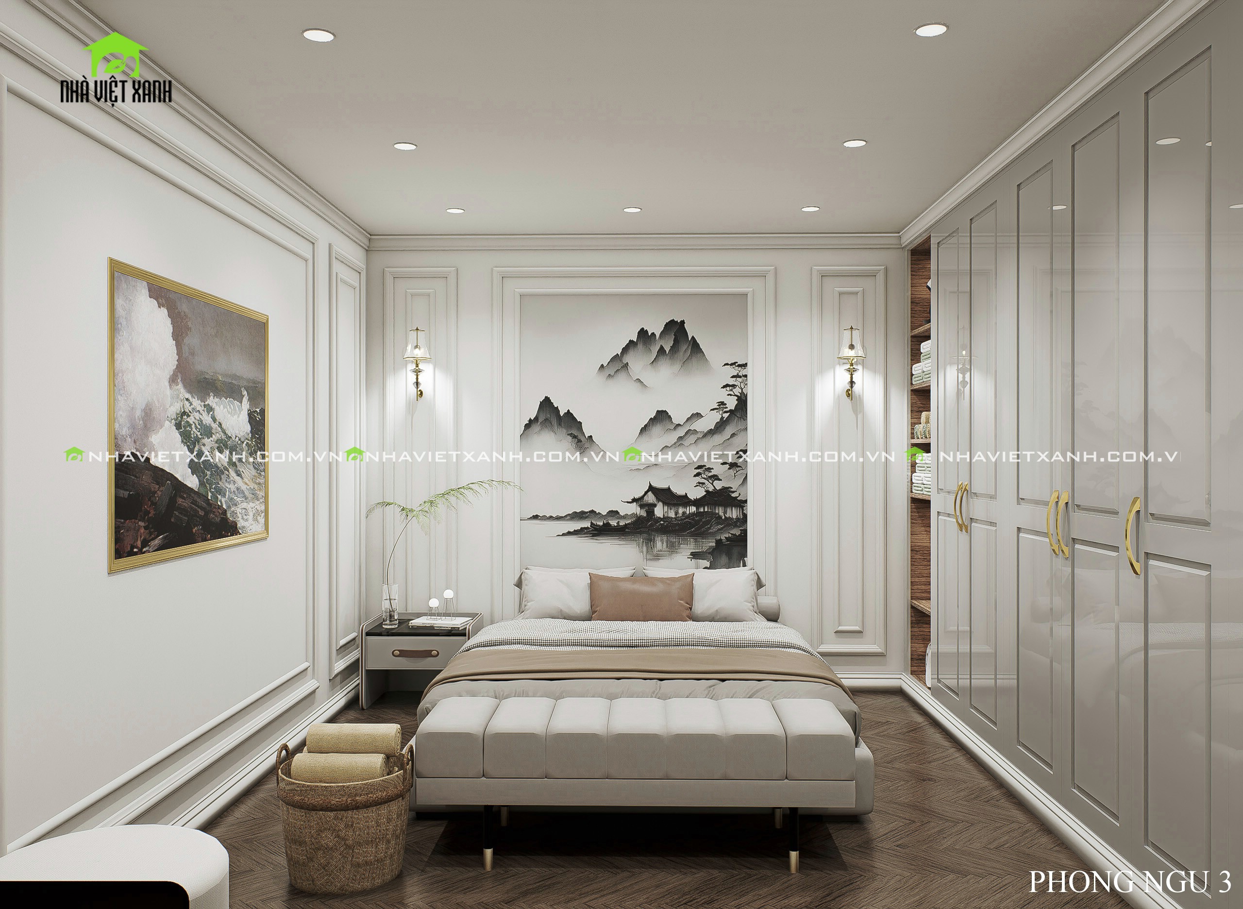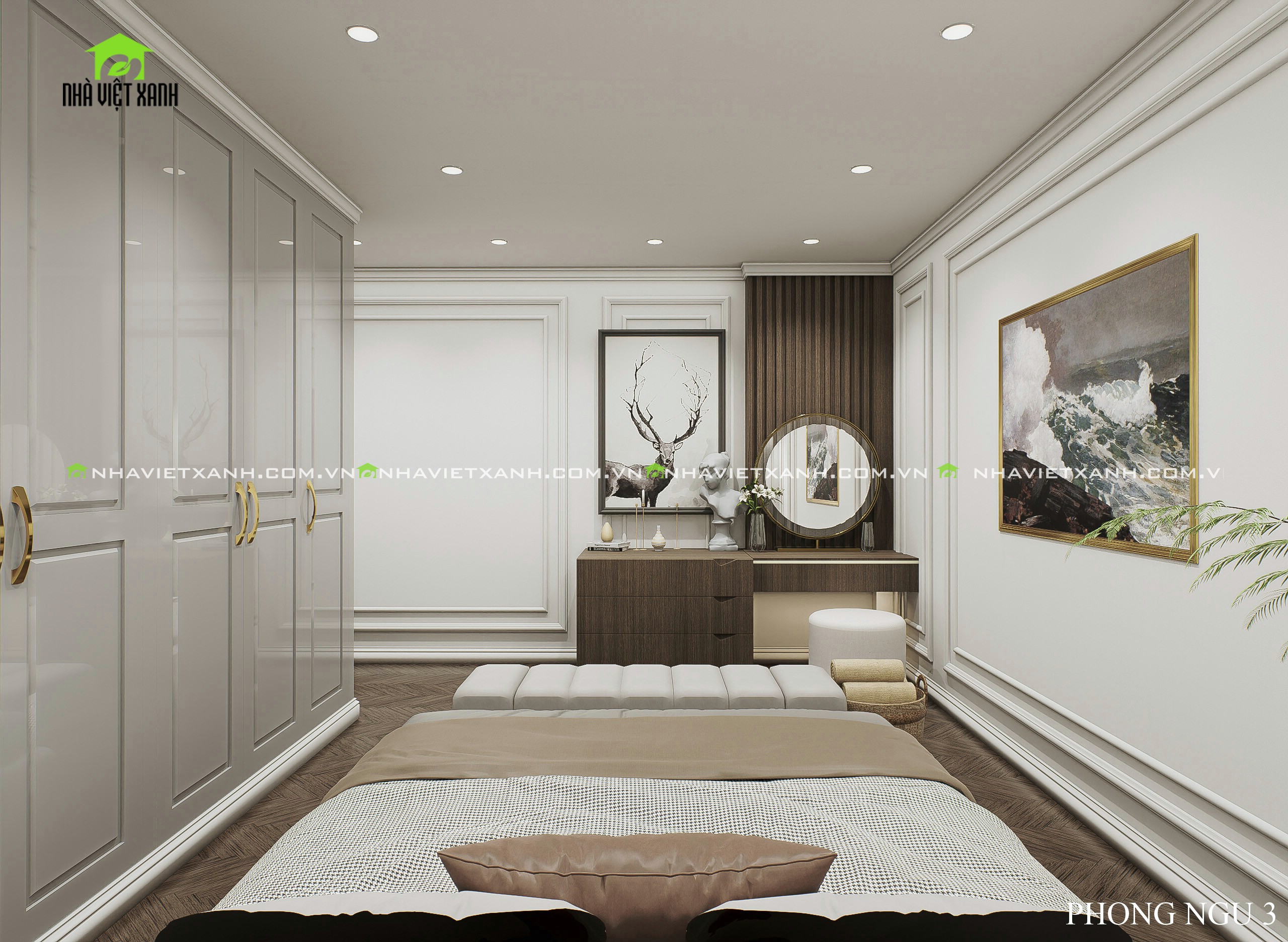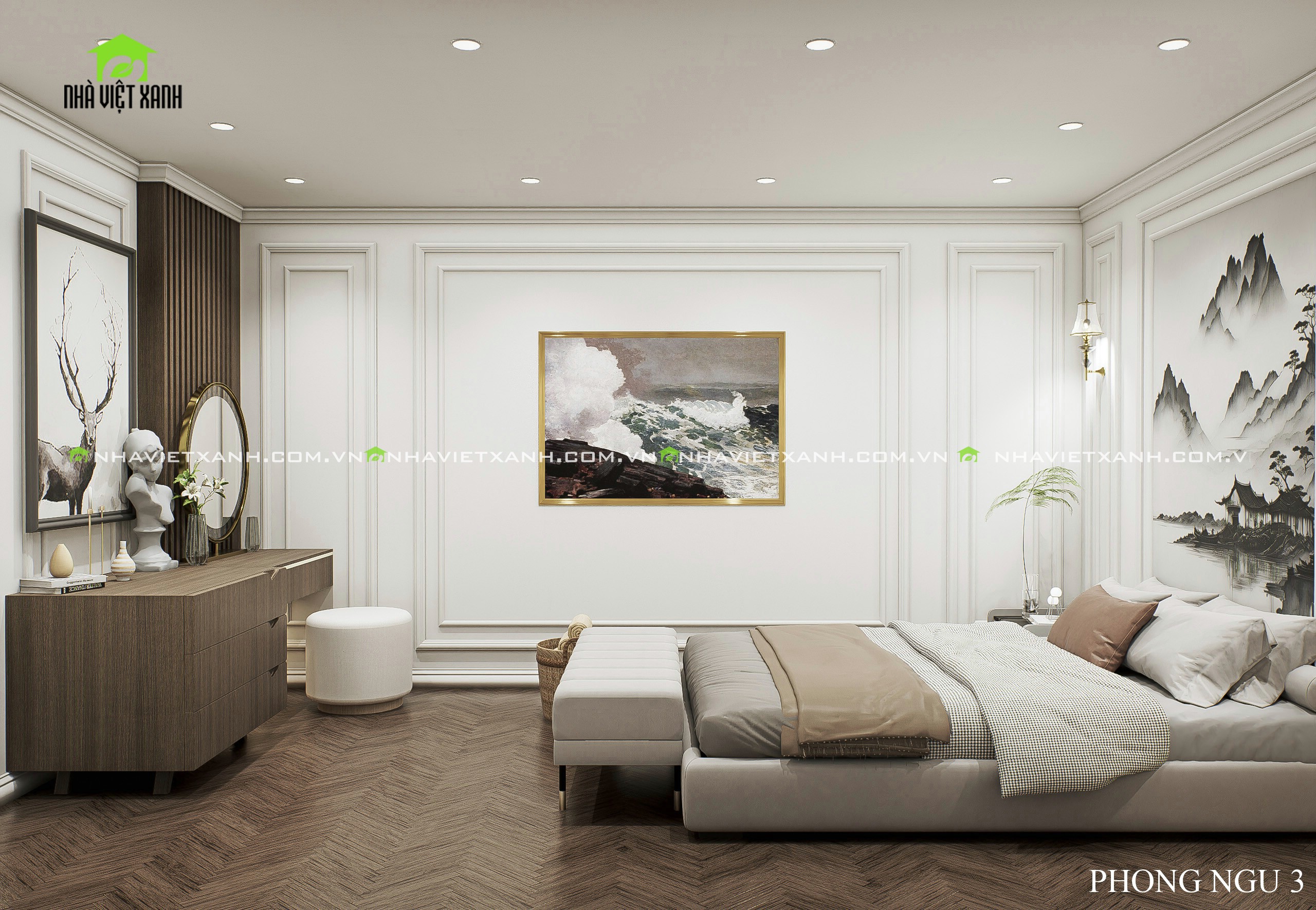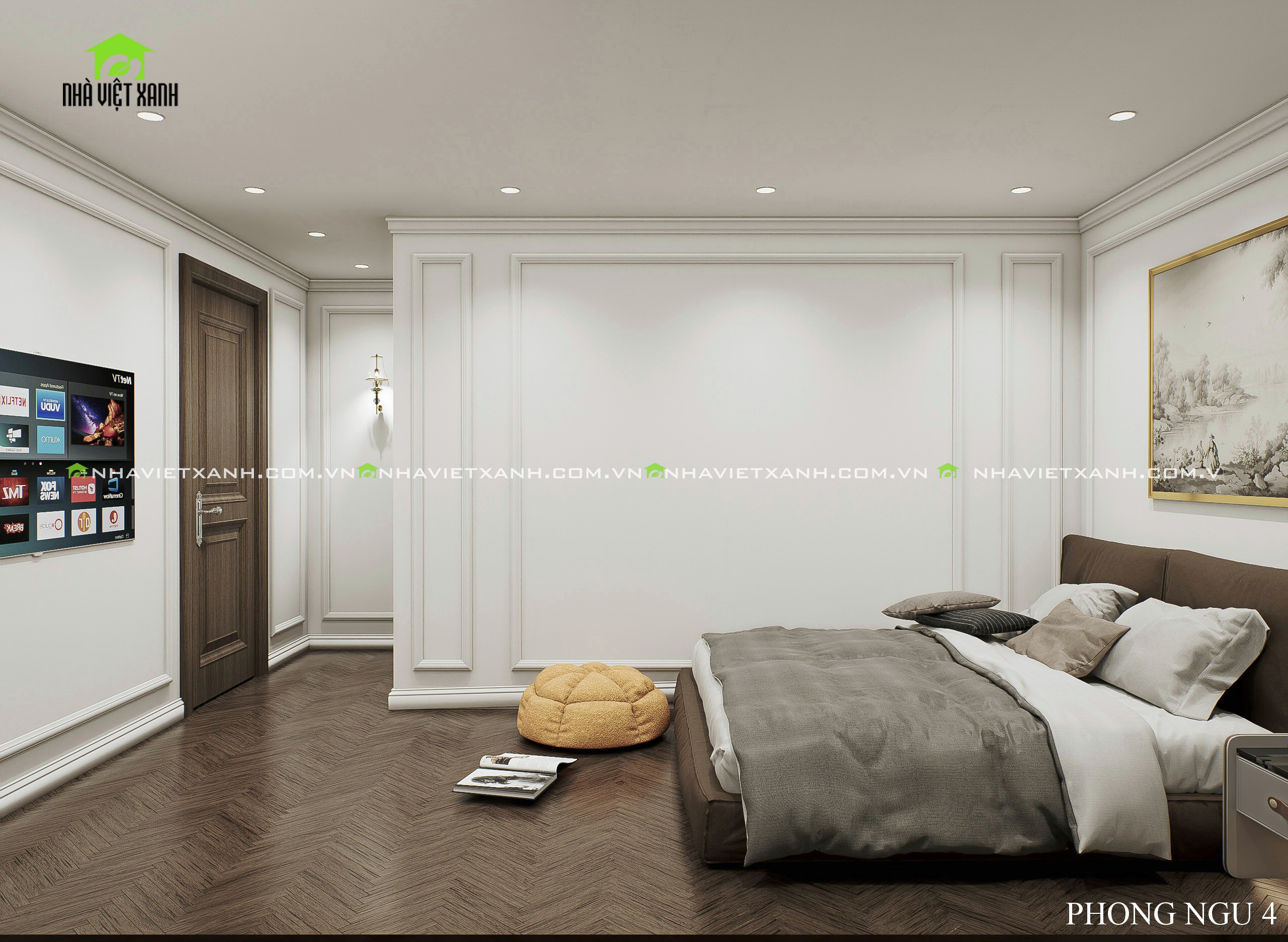 • Phòng ngủ master: Rộng rãi, tích hợp bàn trang điểm, kệ tivi và không gian đọc sách riêng tư.