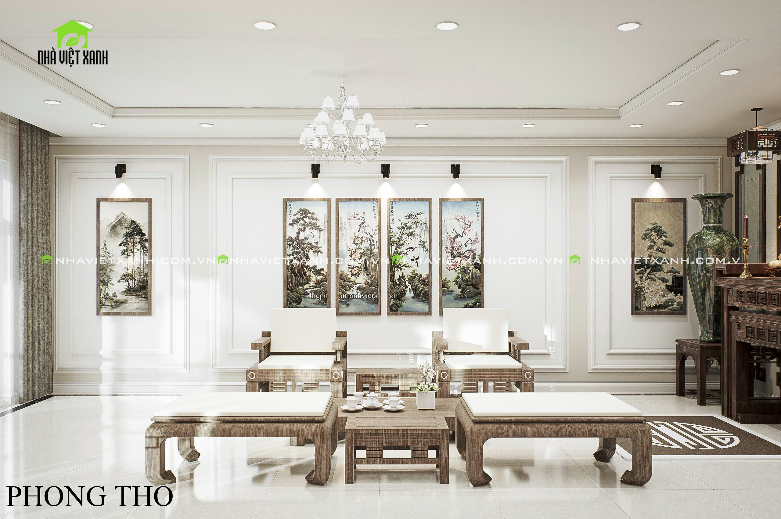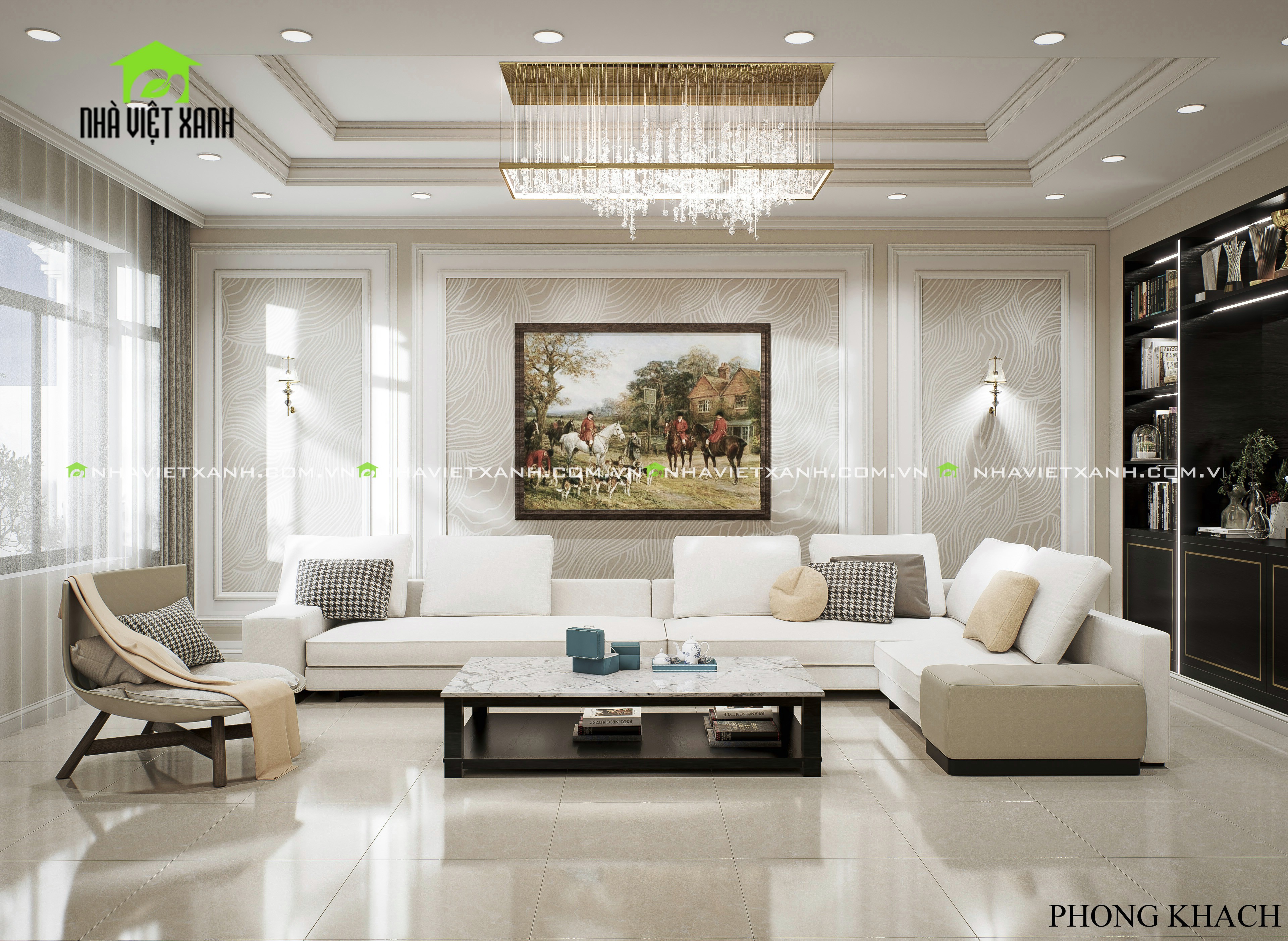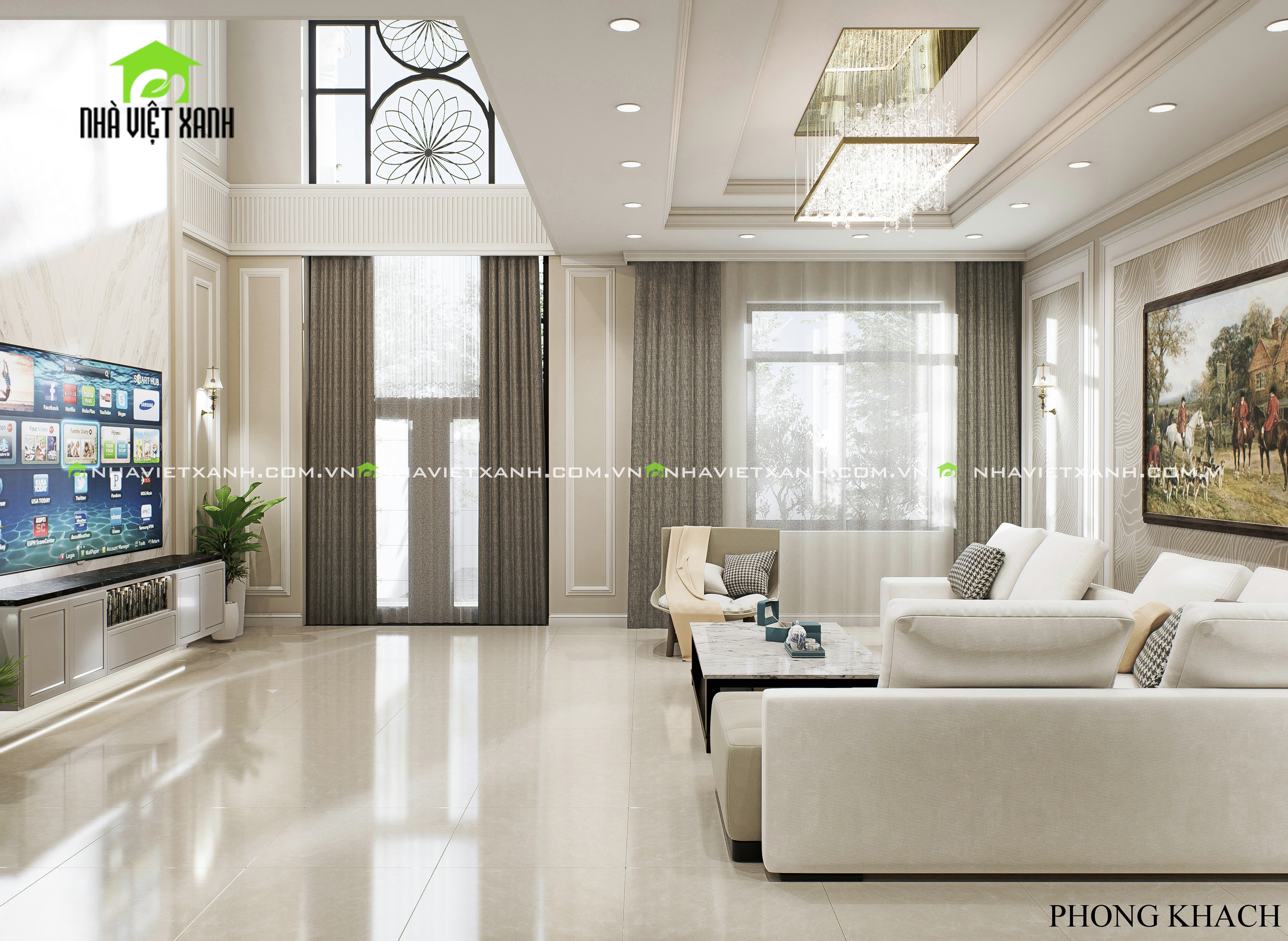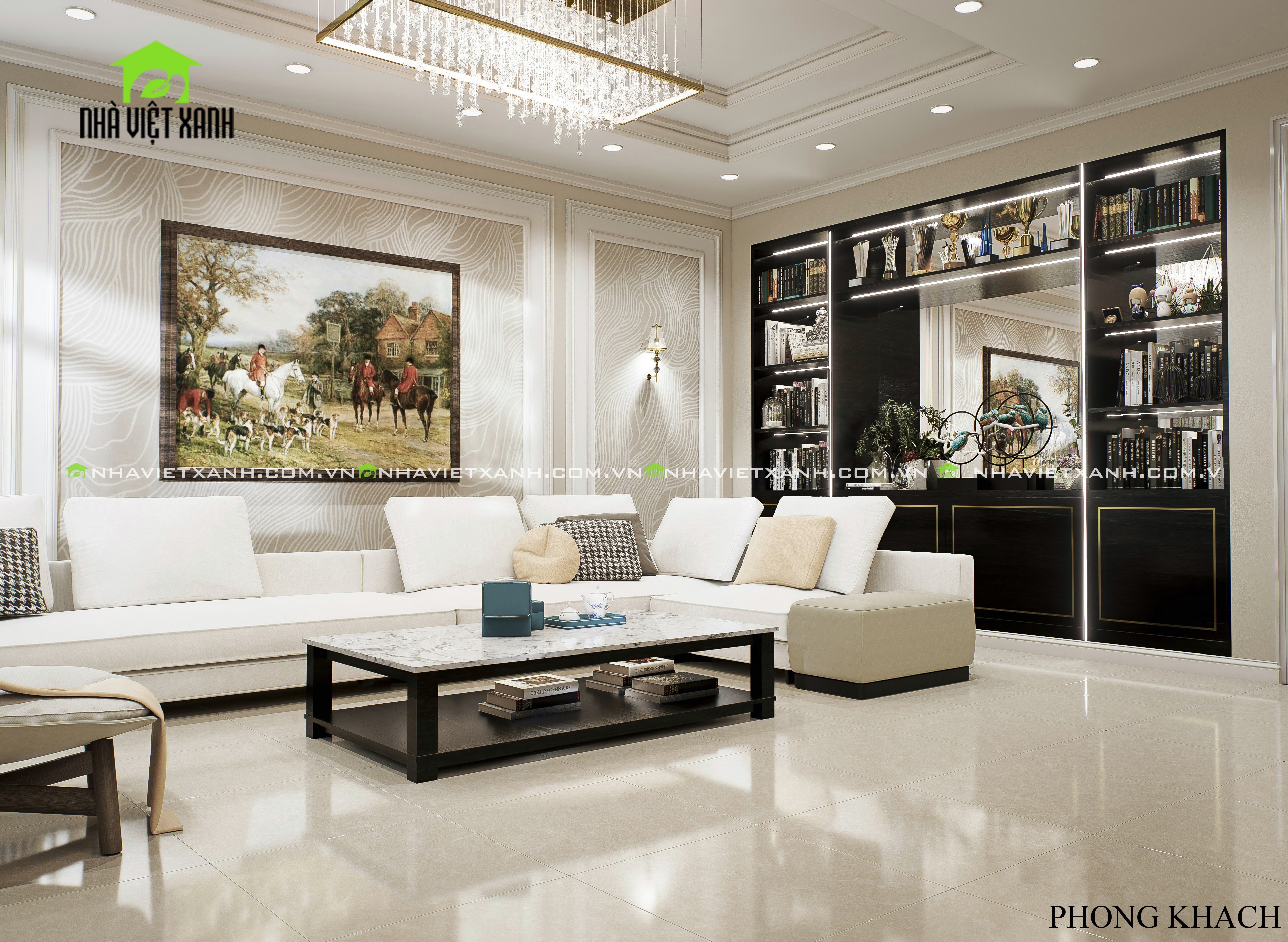 • Phòng khách: Sử dụng gam màu kem – xám sang trọng, kết hợp với tranh treo tường cổ điển và bộ sofa cao cấp.