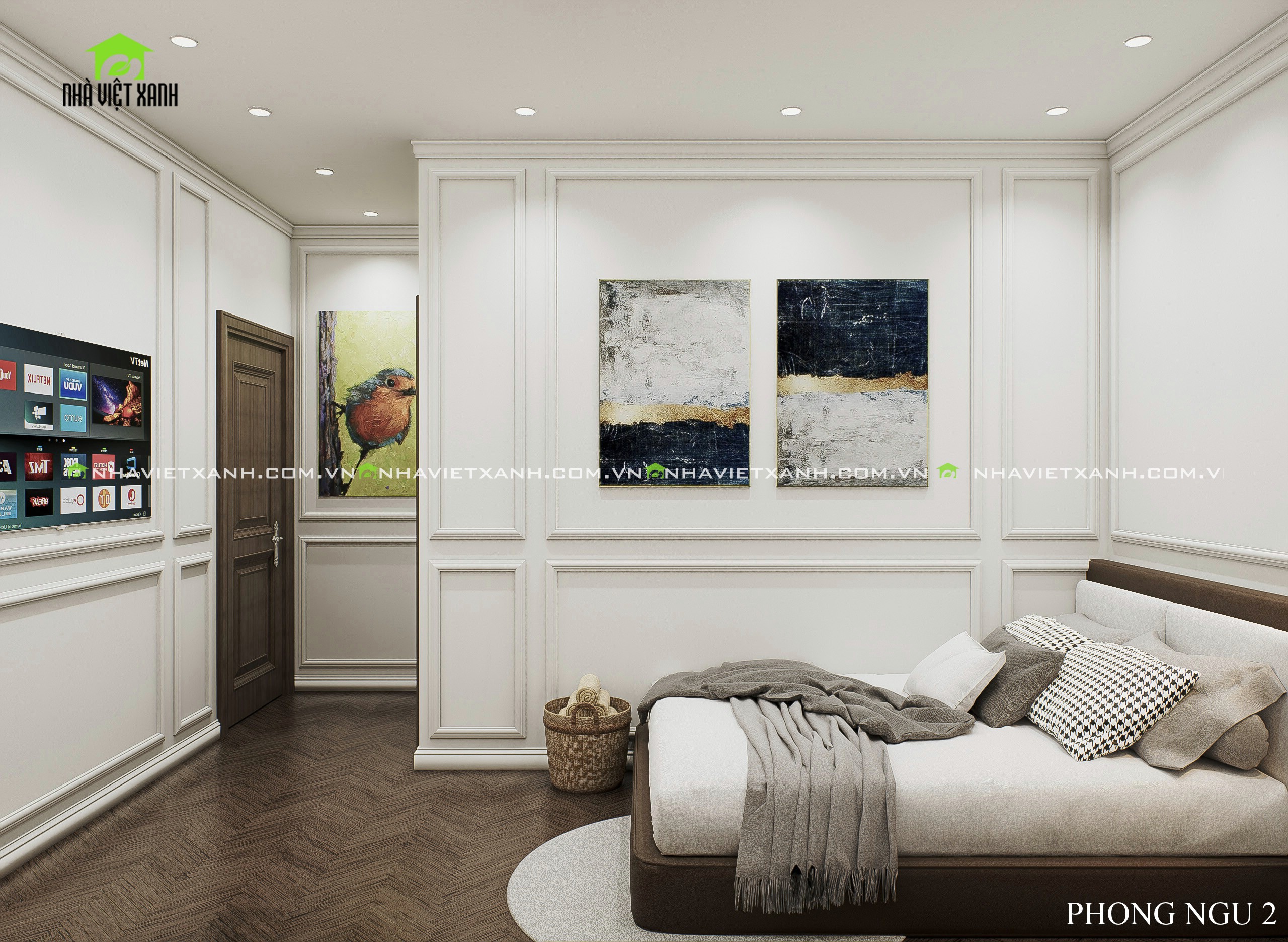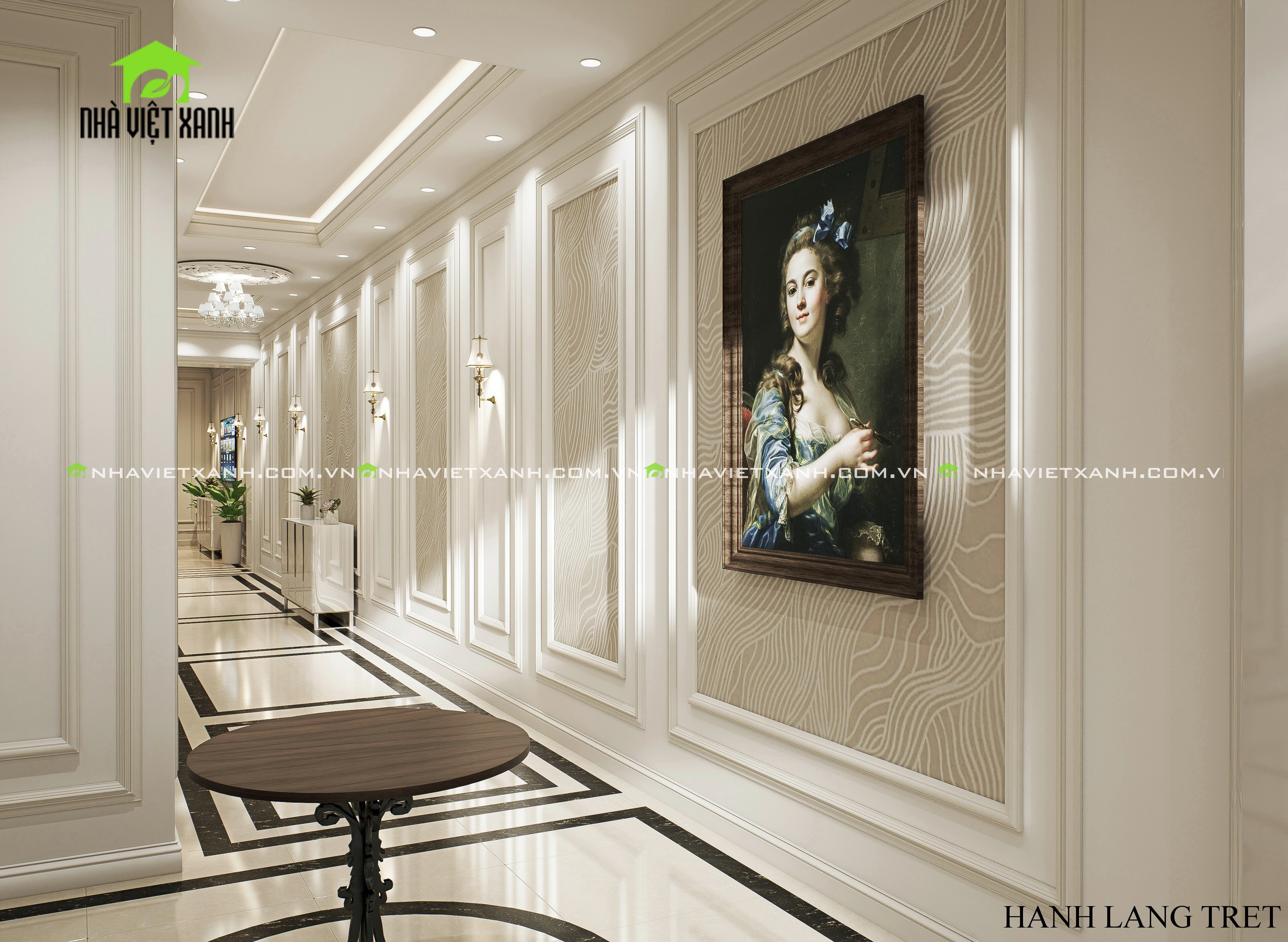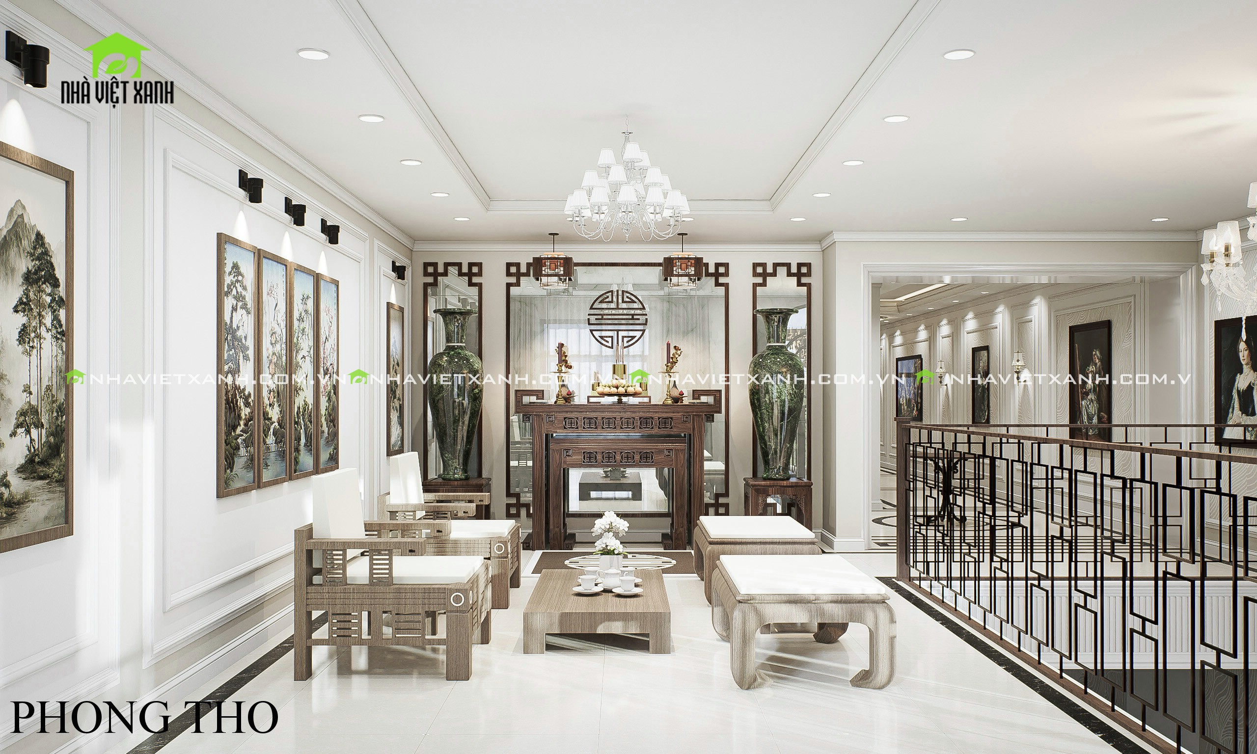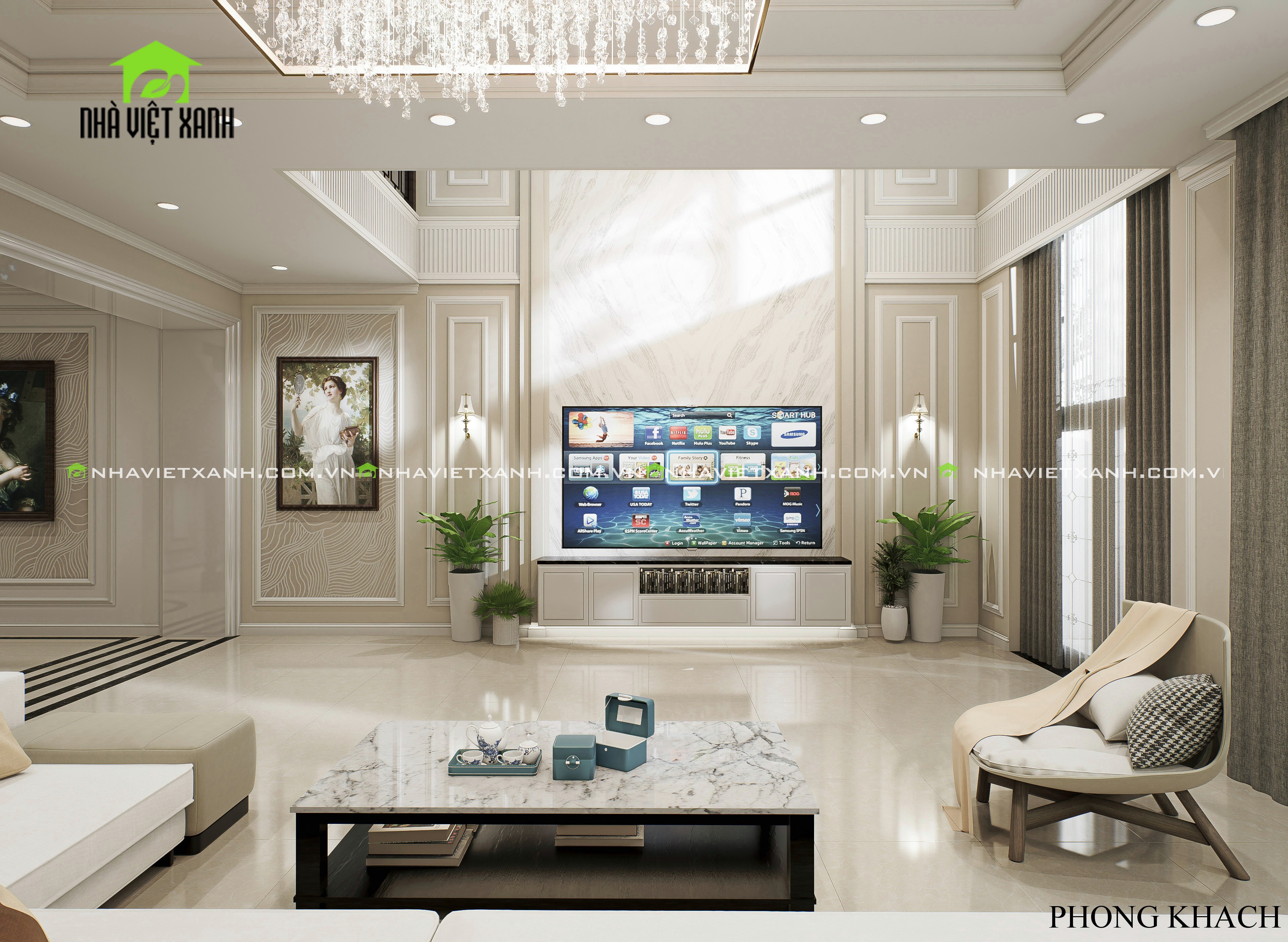 • Phòng khách: Sử dụng gam màu kem – xám sang trọng, kết hợp với tranh treo tường cổ điển và bộ sofa cao cấp.