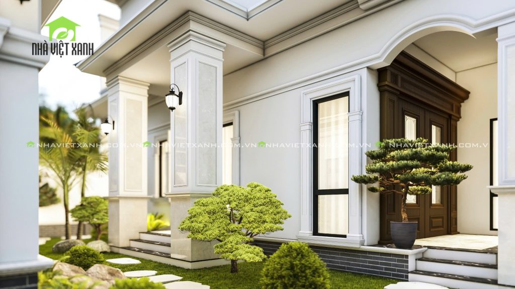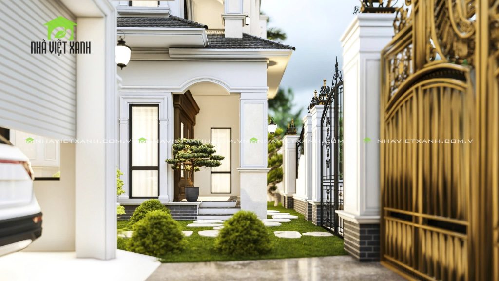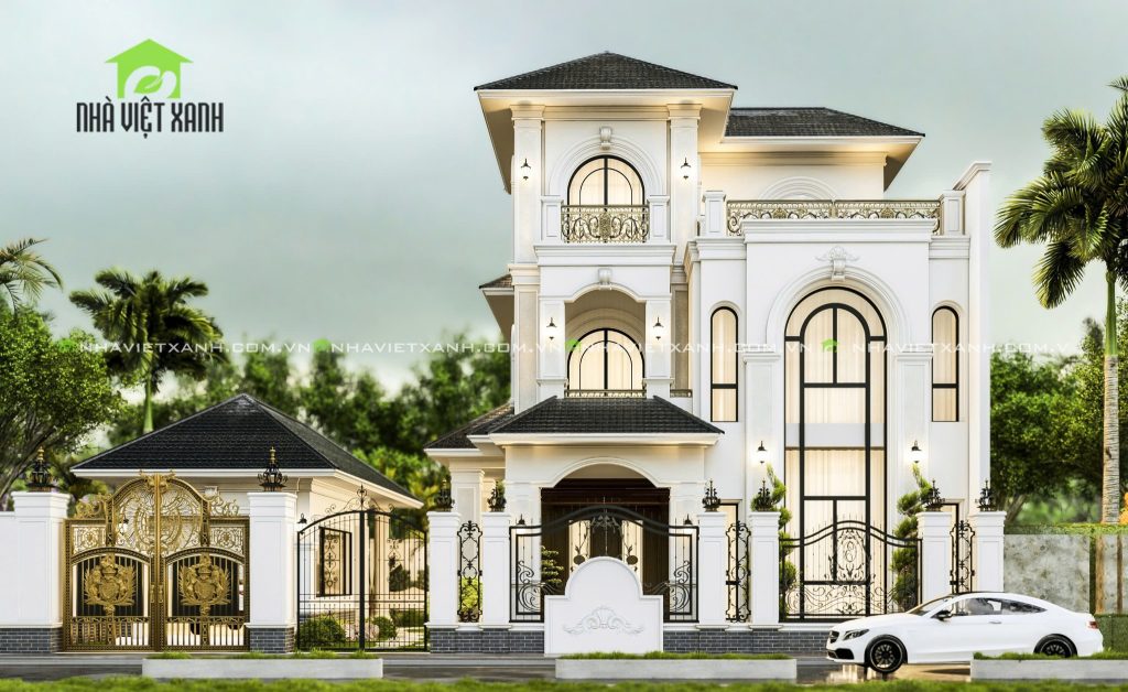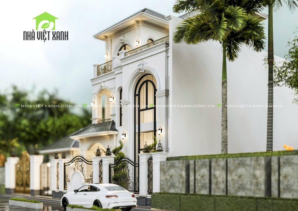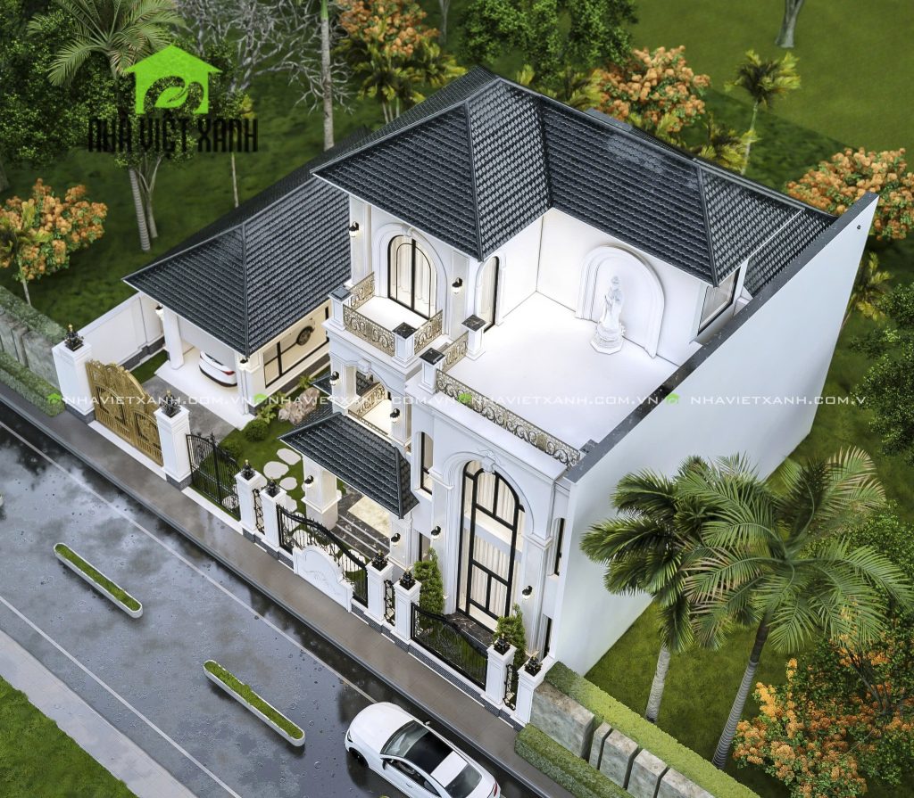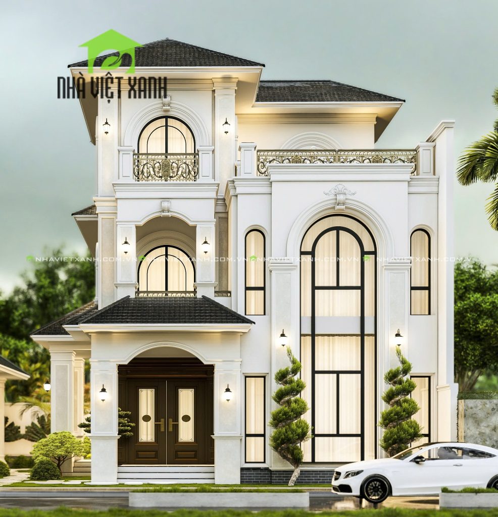 Ngôn ngữ thiết kế biệt thự tân cổ điển được thể hiện trọn vẹn qua hệ thống cửa vòm, cột Ionic và lan can ban công bằng sắt nghệ thuật. Tông trắng chủ đạo kết hợp mái ngói màu than tạo cảm giác nhẹ nhàng nhưng đầy nội lực, đúng chuẩn quý phái kiểu châu Âu.