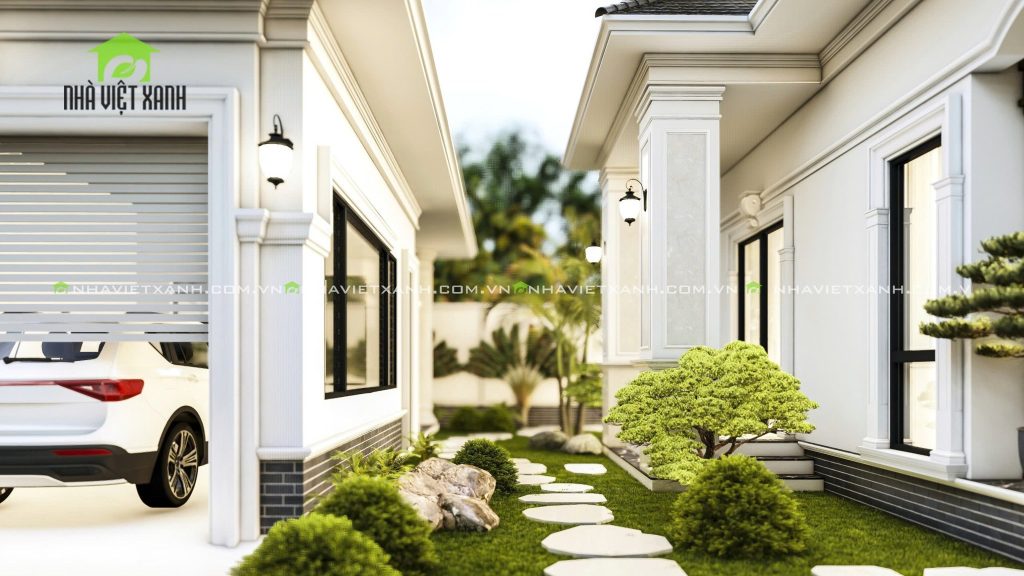 Không chỉ đẹp ở phối cảnh tổng thể, công trình còn nổi bật nhờ cảnh quan sân vườn được chăm chút. Lối đi lát đá dẫn vào khu tiểu cảnh phía sau, mở ra không gian thư giãn đậm chất Á Đông. Gara bố trí gọn bên hông nhà, tối ưu diện tích mà không làm ảnh hưởng đến mặt tiền.
