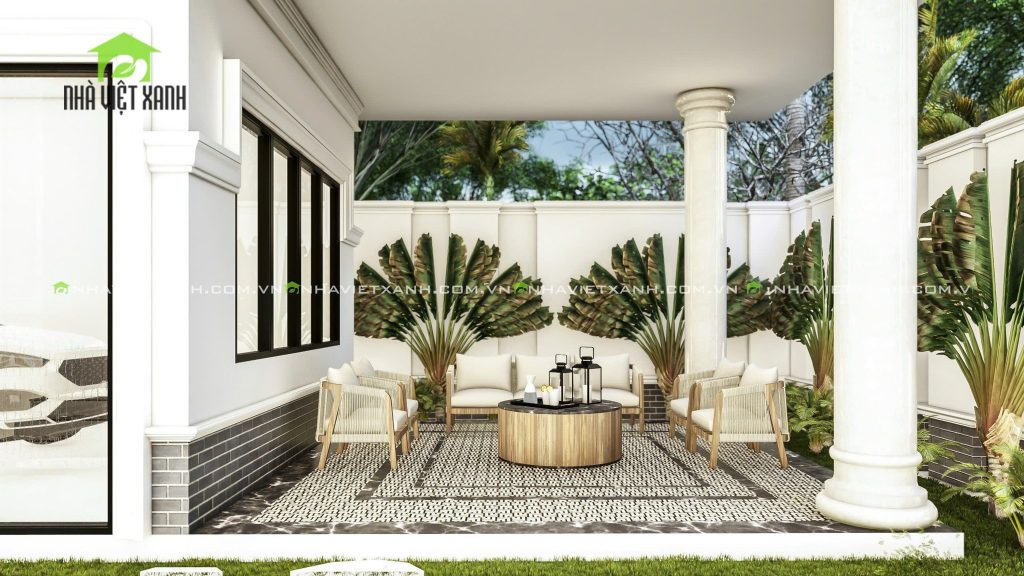 Sân chơi bên hông, khu tiếp khách ngoài trời với bàn trà kiểu dáng hiện đại là điểm cộng giúp ngôi nhà trở nên đậm chất nghỉ dưỡng. Đây chính là một ví dụ điển hình cho việc ứng dụng thành công phong cách biệt thự tân cổ điển vào đời sống Việt Nam.
