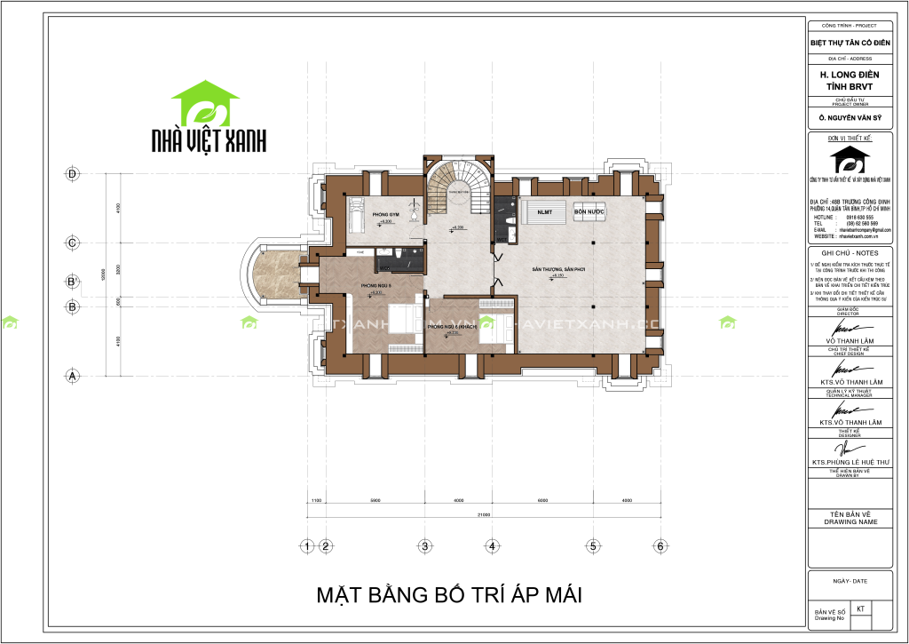 Tầng áp mái: phòng ngủ, phòng thờ, phòng gym, sân thượng, giặt phơi, kỹ thuật, bồn nước