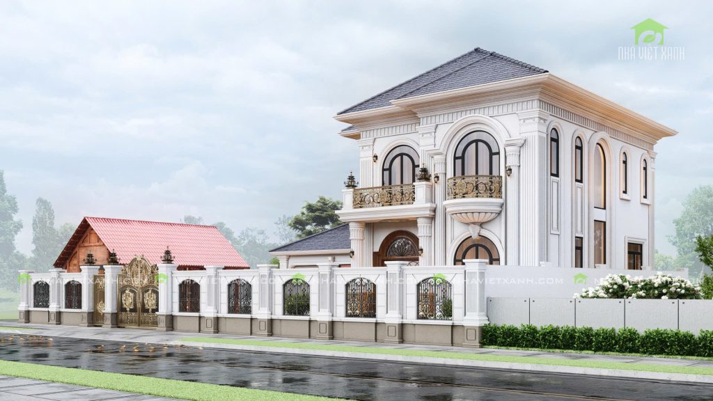 Mặt tiền rộng 9m được chia bố cục đối xứng, nổi bật với hệ cột trụ lớn, vòm cong mềm mại và lan can ban công sắt mỹ thuật sơn giả đồng. Toàn bộ phần cửa đều sử dụng chất liệu nhôm kính cao cấp kết hợp khung vòm tân cổ điển, làm tăng sự sang trọng cho mặt tiền công trình.