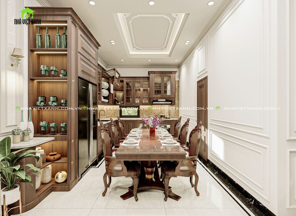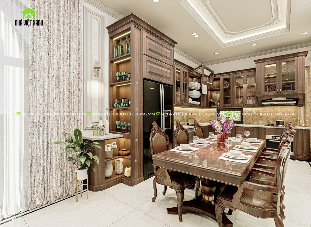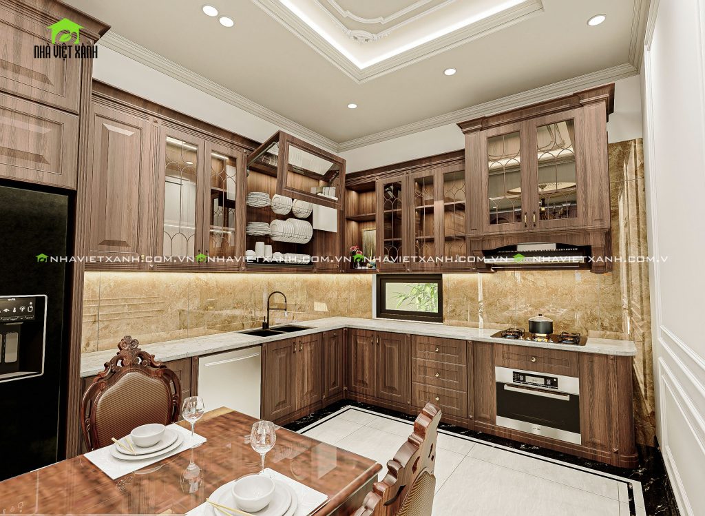 Phòng bếp ấm cúng, thiết kế chữ L gọn gàng, mặt đá marble, tủ bếp kính kết hợp tủ gỗ chạm tinh tế.