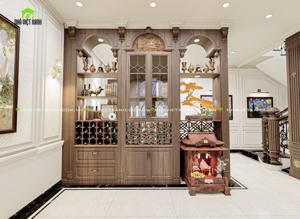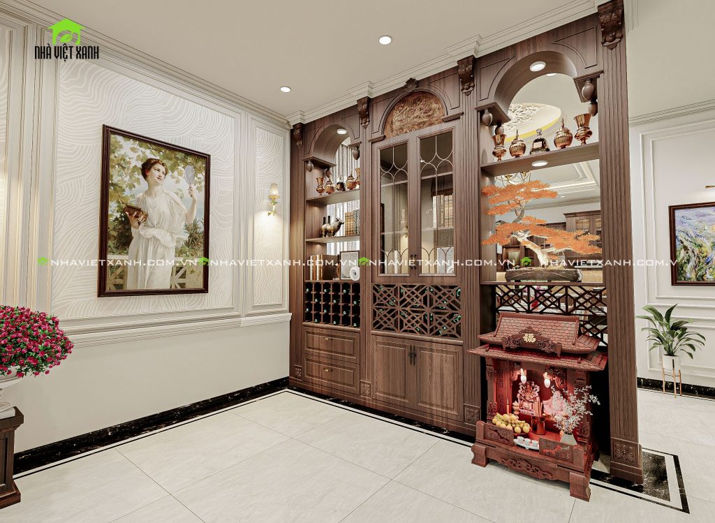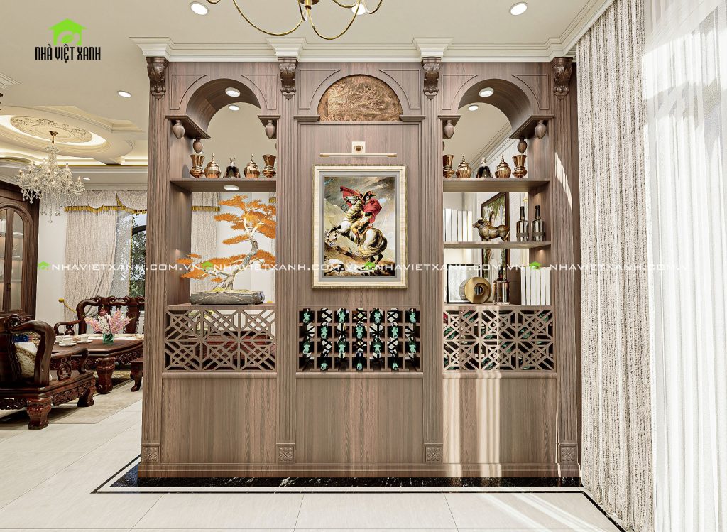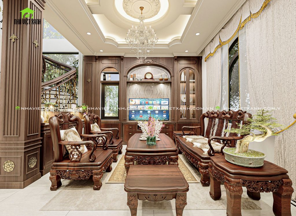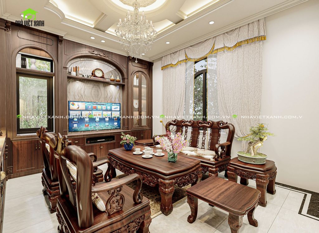 Phòng khách với bộ bàn ghế chạm trổ cầu kỳ, kệ TV âm tường, vách gỗ CNC kết hợp phào chỉ sơn trắng.