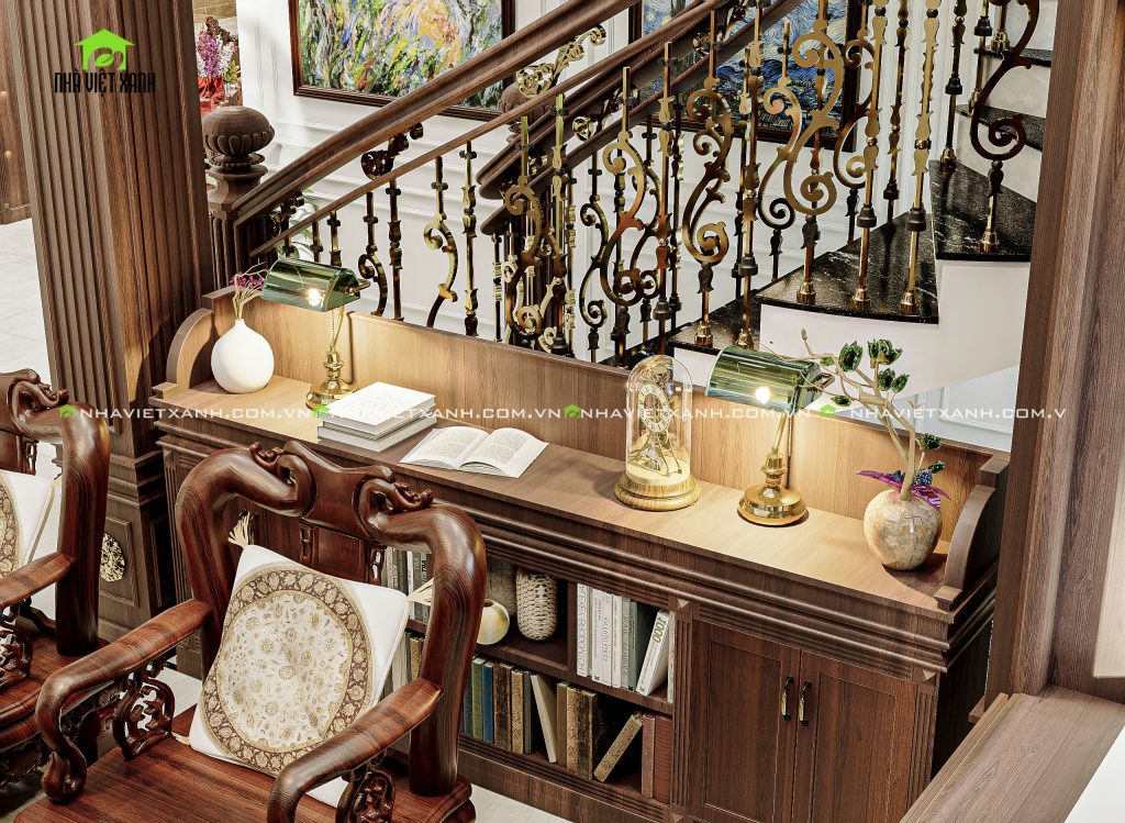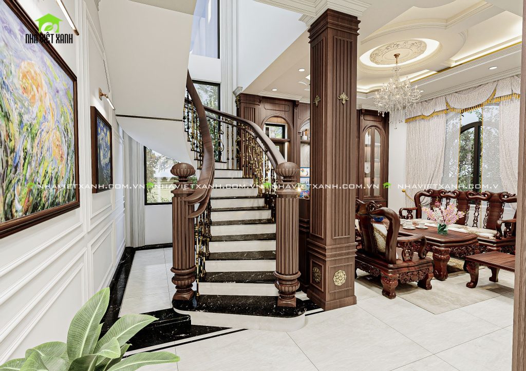 Cầu thang thiết kế tay vịn gỗ – lan can sắt mỹ thuật đồng bộ với phong cách cổ điển tổng thể.